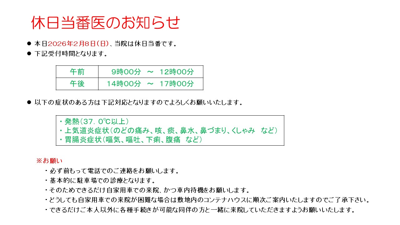 | 午後 14:00-15:00 (お子様の予防接種、各種検査) |