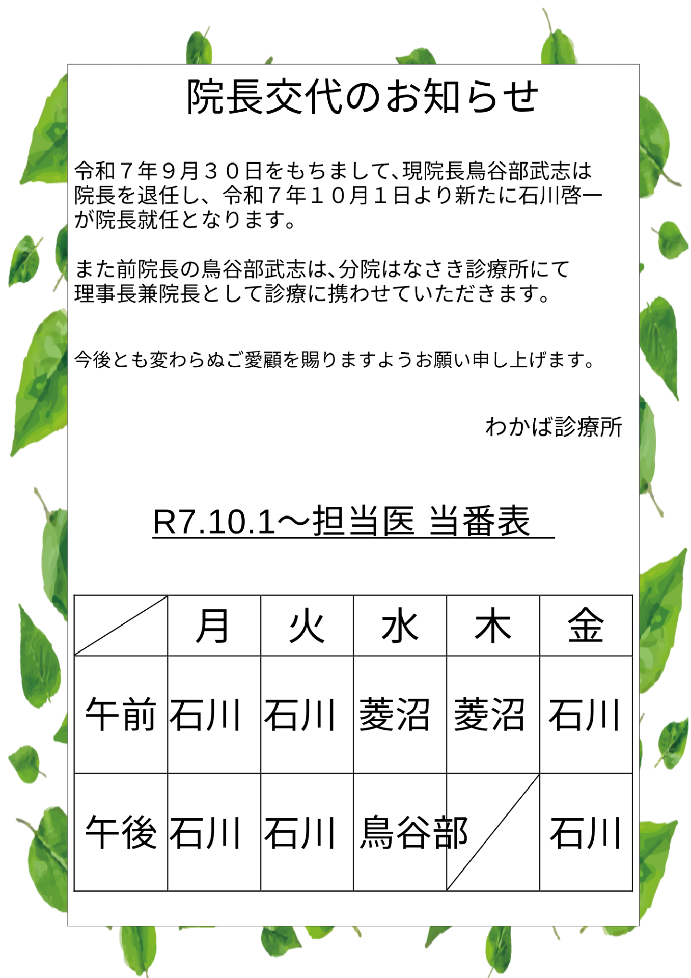2020年1月より前々院長の菱沼先生よりわかば診療所を引き継ぎ、コロナ禍の中診療所を切り盛りし、2025年10月より新院長の石川先生へと院長を引き継がせていただきました。